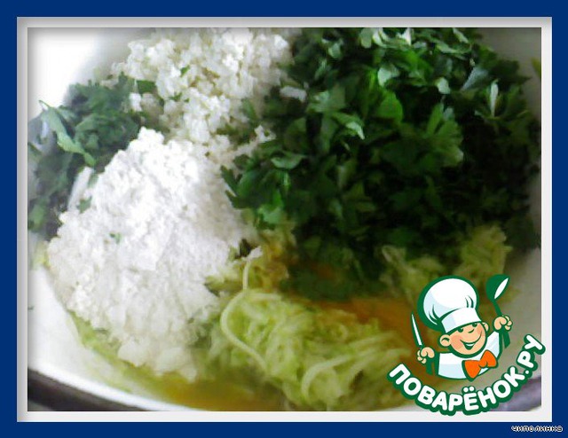 После добавить яйца, муку, протертый творог, нарезанную зелень.
