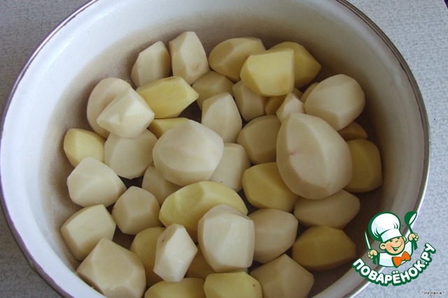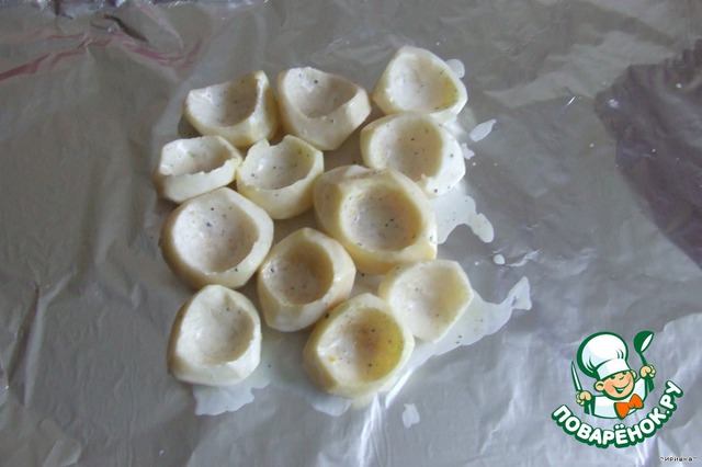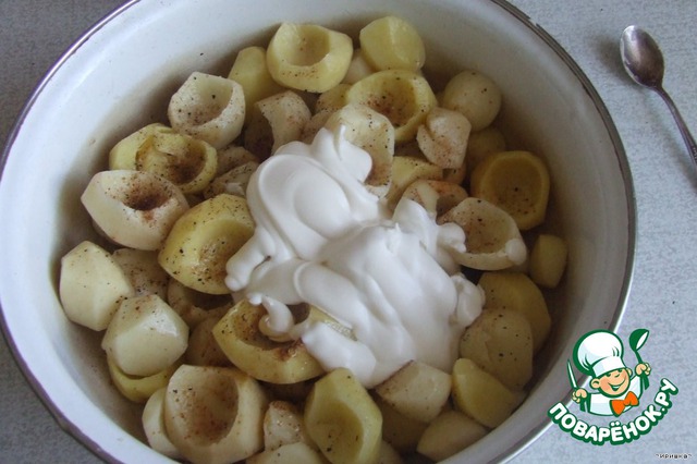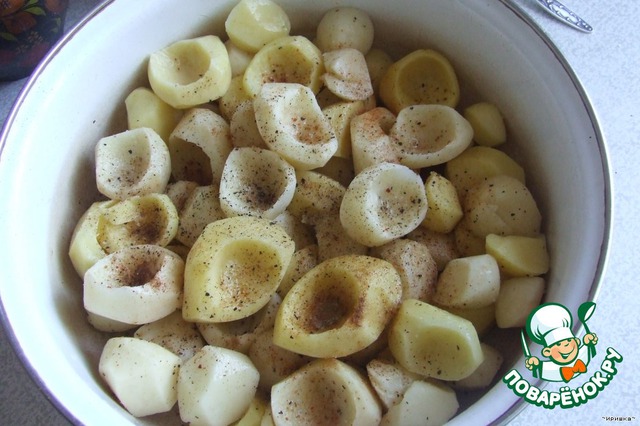 Аккуратно ложечкой сделать углубления (я это делаю для того, чтобы картофель при готовке хорошо пропитался, но можно его просто разрезать пополам; а еще я стараюсь брать картофель средний). Добавляем специи по вкусу.