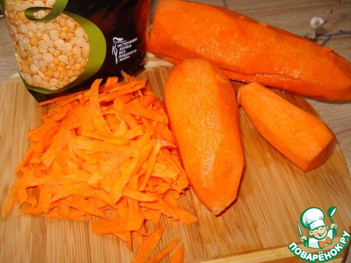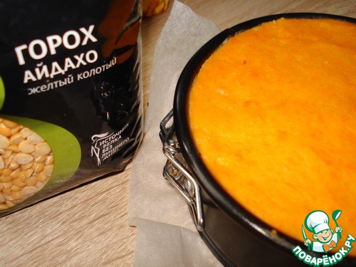 В горох добавить морковь, пюрировать все блендером. (ну если нет блендера прокрутить несколько раз через мясорубку).