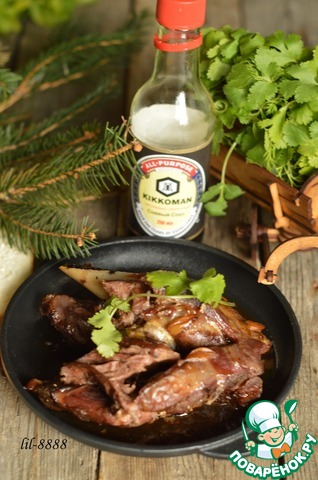 3. Духовку разогреть до 160С. Форму накрыть фольгой и запечь мясо до готовности. У меня запекалось около 2 часов. Ориентируйтесь на качество мяса и на свою духовку.