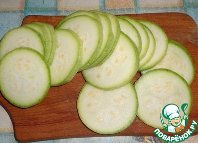 Кабачок порезать кружочками. Толщиной 2-3 мм, чем тоньше, тем лучше.