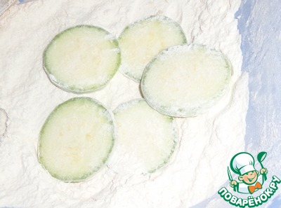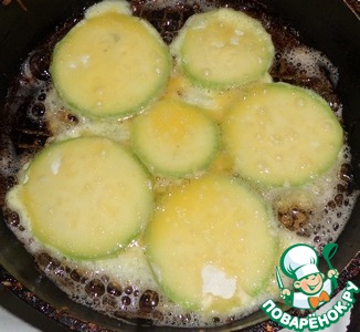 Кружочки кабачка обмакнуть в яйцо и жарим на растительном масле с двух сторон до золотистого цвета.