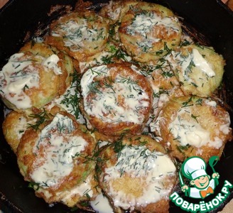 Обжаренные кабачки выкладываем в форму для запекания (с крышкой) и каждый слой смазываем сметаной. Последний верхний слой также смазать сметаной и посыпать порезанным мелко укропом.
