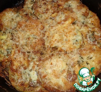 Сверху посыпать колбасным сыром, натертым на мелкой терке.