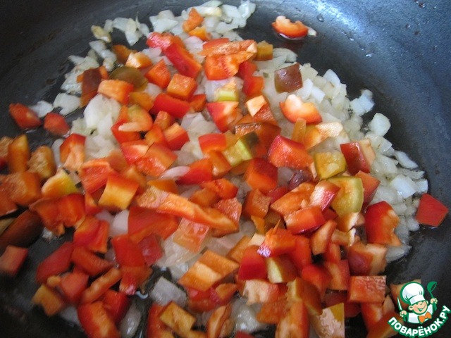 Нарезать лук и чеснок. Вычистить семечки и нарезать кубиками болгарский перец. Корень имбиря очистить от кожицы и натереть его на терке. Раскалить в сковороде кунжутное масло и обжарить до цвета золота лук и чеснок. Добавить имбирь и перец, тушить пару минут.