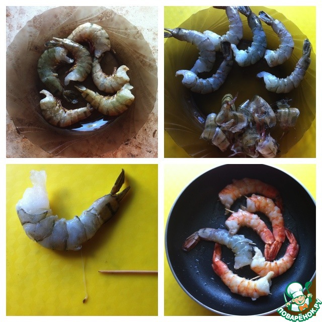 Креветки постепенно разморозить в холодильной камере, очистить от панциря, удалить кишечную вену, хвостики оставить. Нанизать каждую креветку на шпажку (зубочистку), чтобы при термообработке они не свернулись кольцами. Обжарить на смеси растительного и сливочного масла до порозовения, не пересушить!