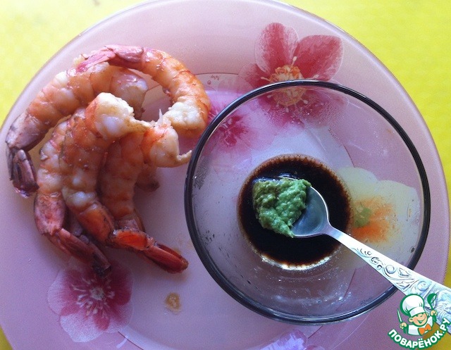 Соединить соевый соус с васаби, перемешать, залить смесью креветки, периодически встряхивать или перемешивать, чтобы пропитались!