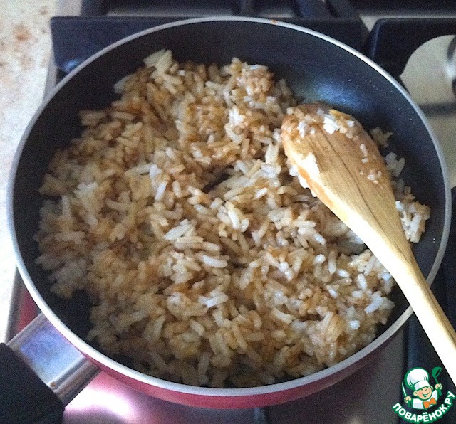 Отварить рис удобным способом (я варила 1 (рис) к 2 (вода). Не солить! Рис должен получиться не очень рассыпчатым, но и не клейким.