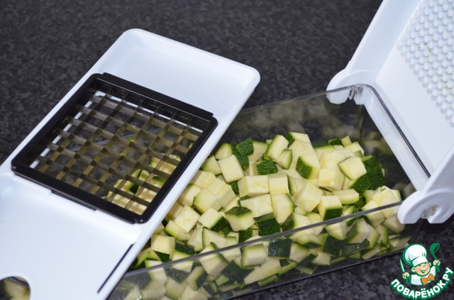 Цукини нарезать, не сильно крупными кубикоми. У меня вот такая помощница.