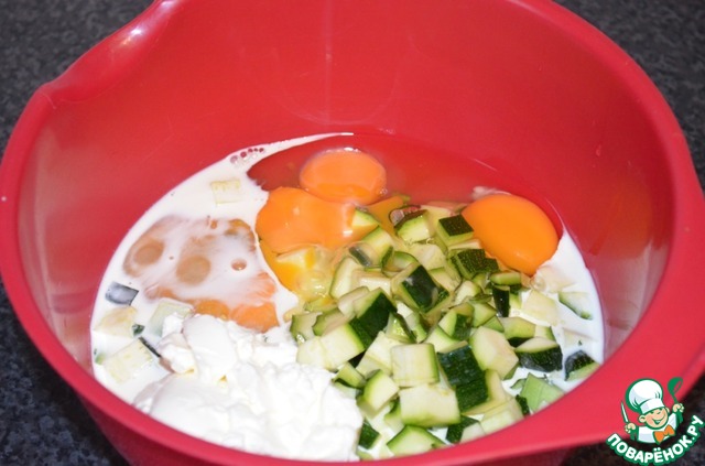 В миске смешать цукини с яйцом, сливками, сметаной. Добавить наши специи, молотый чёрный перец, соль, молотый мускатный орех.