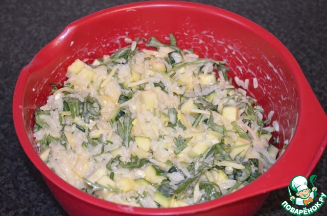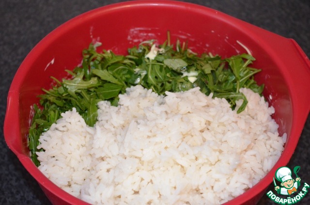 Рукколу порубить, не сильно крупно. Добавить остывший рис, 100 гр. тёртого на крупной тёрке, твёрдого сыра.