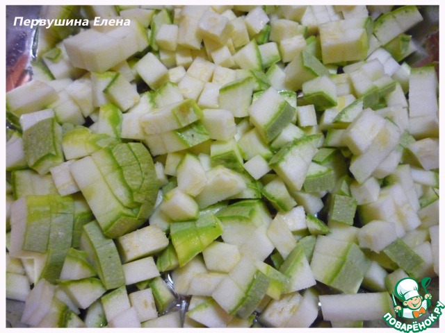 Кабачок режем кубиками и кладем на сковороду с раскаленным маслом.