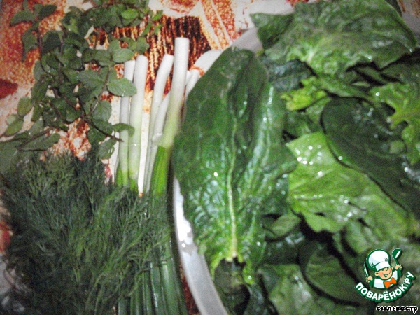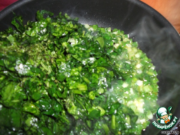 Режем зеленый лук, пассеруем его на оливковом масле. Кладем шпинат, хорошо вымешиваем и пассеруем 2-3минуты. Добавляем мелко нарезанный укроп и мяту. Немного подсаливаем и перчим. Отставляем в сторону, чтобы остыло.