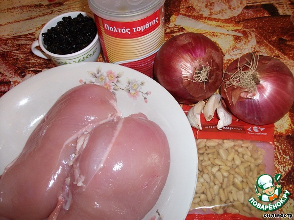 Итак, на нашем противне имеется 2 больших листа из листов лазаньи и между ними шпинат. Теперь выкладываем куриную грудку и разравниваем.
