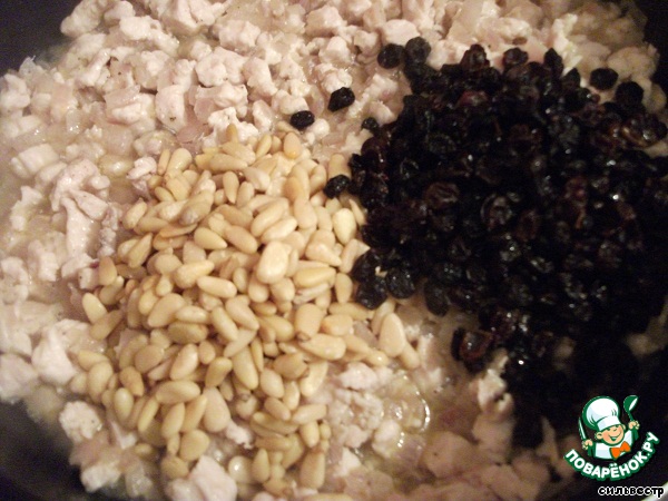 Лук мелко режем, пассеруем до прозрачности, добавляем мелко нарезанную грудку и чеснок, выдавленный прессом или тертый. Солим, перчим и пассеруем, пока мясо не приобретет белый цвет из розового.