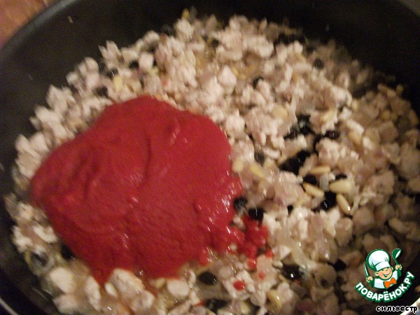 Томат-пасту разводим в 3-4 ст.л. воды и выливаем к грудке. Размешиваем, даем закипеть и выключаем.