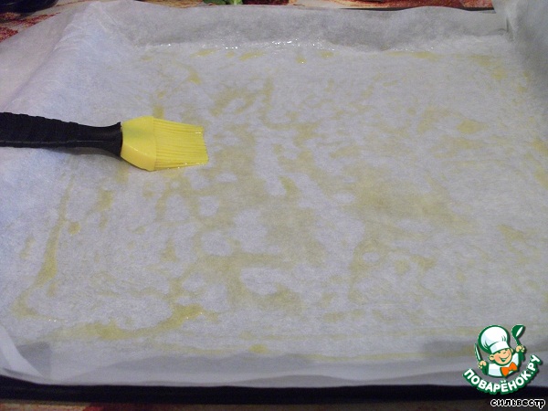 Теперь приступаем к нашей лазанье. Сначала на противень расстилаем 2 листа пергаментной бумаги, гораздо больше размером, чем противень. Внутренний лист смазываем оливковым маслом.
