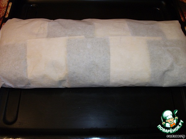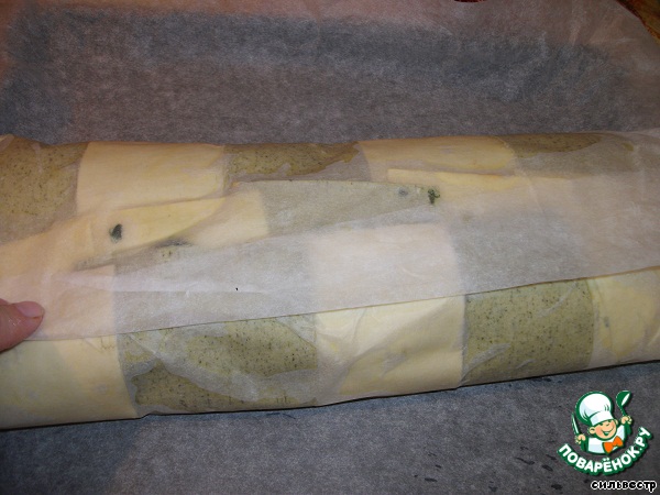 Чтобы наш рулет не развалился от внутренних соков, заматываем его и вторым листом пергамента.