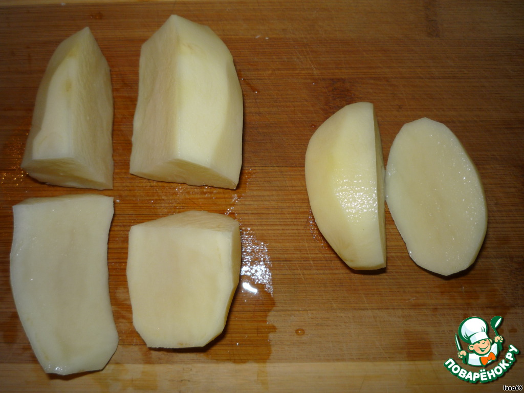 Очищаем и режем картофель. Средний на 2 части, а крупный на 4 части.