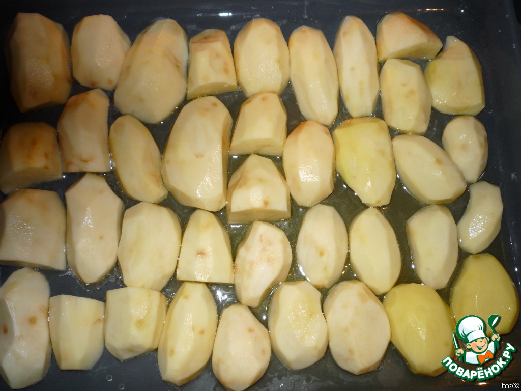 Наливаем на противень растительное масло и укладываем картофель ровным срезом вниз. Солим, перчим по вкусу.Солим немного (сало само отдаст соль картофелю). Ставим в разогретую духовку на 15-20 минут, чтобы картофель немного запёкся.