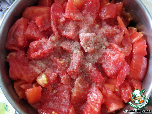 Томаты ошпариваю кипятком и, отделив кожуру, нарезаю.