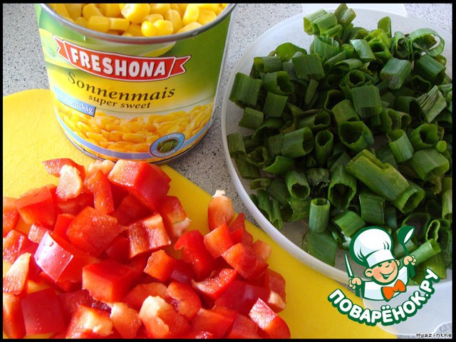 Обжариваем в растительном масле паприку - 5 минут, добавляем лук, перемешиваем,