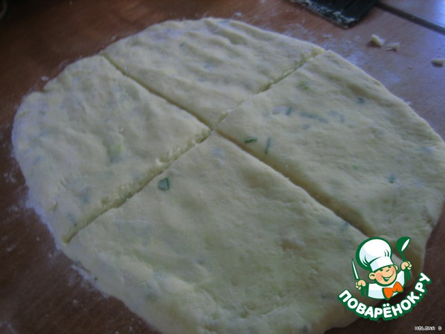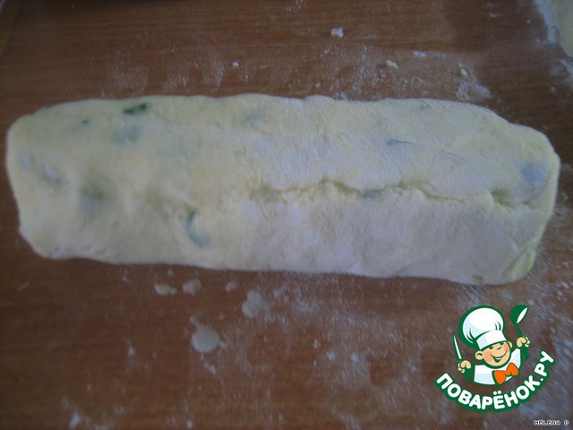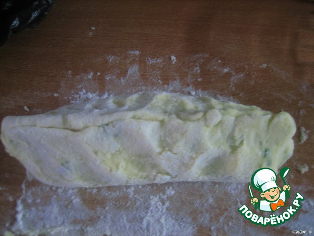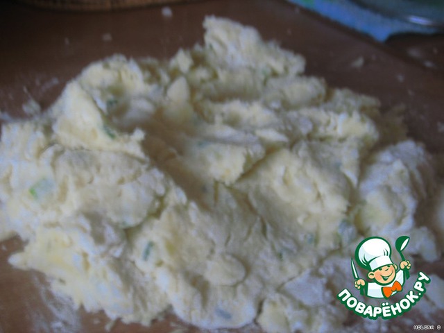 Замешиваем из картофельного пюре (в которое уже добавлен зеленый лук), 2 желтков и муки наше "тесто"