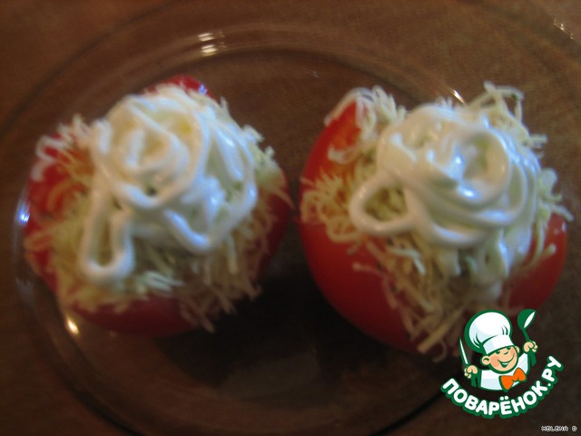 На мелкой терке измельчаем сыр, добавляем выдавленный чеснок, перемешиваем, наполняем розочки и сверху украшаем майонезом...