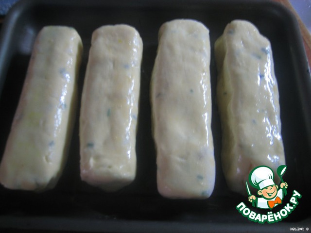 Выложить на смазанный жиром противень, смазать растопленным маслом и запечь в духовке при t 180гр 15-20 минут