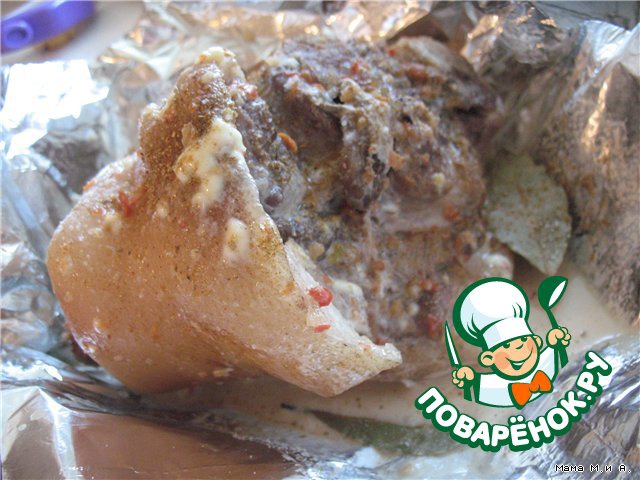 Нагреваем духовку до 180 гр. Кладем ноги в фольге в духовку и запекаем .Через 1-1.5 часа раскрываем фольгу и даем рулькам зарумяниться (15 мин).