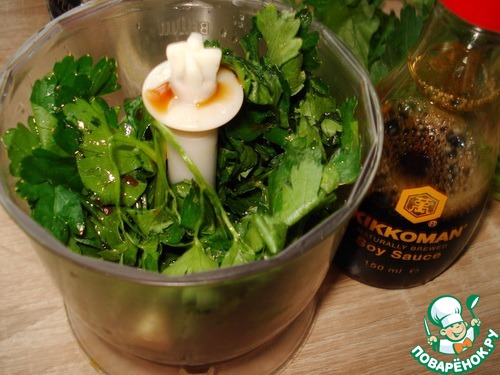Петрушку, чеснок, оливковое масло и соевый соус ТМ Kikkoman добавим в чашу блендера и пюрируем до однородной консистенции.