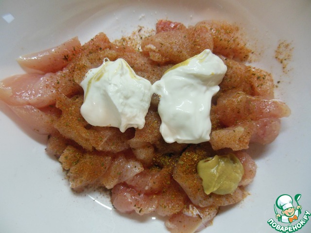 Грудку замаринуем. Добавим соль специи, сметану и горчицу. Перемешаем и отставим в сторону.