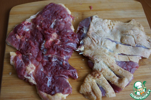 слегка отбиваем, солим, перчим по вкусу, шкурку