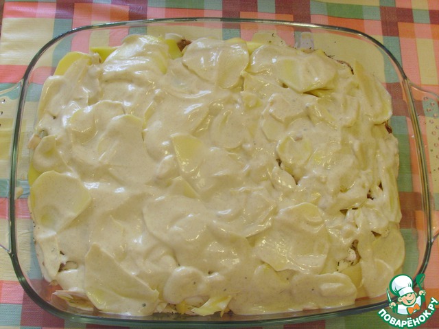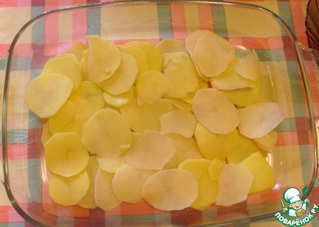Форму можно смазать, я не делала этого, так как в соусе у меня 150 гр. растительного масла. Первым слоем в форму выложить картофель.