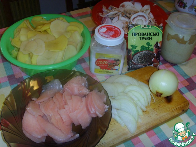 Вот такие продукты вам понадобятся. Вместо соуса можно взять готовый майонез. Картофель и грибы тонко нарезать кружочками (или нашинковать на шинковке или в комбайне), лук - полукольцами, филе - тонкими пластинками.