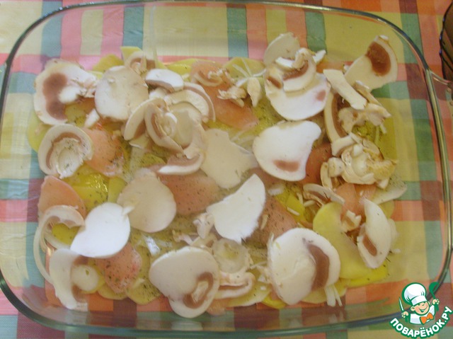 Следующий слой - кусочки филе, затем - грибы, присолить и присыпать Прованскими травами.
