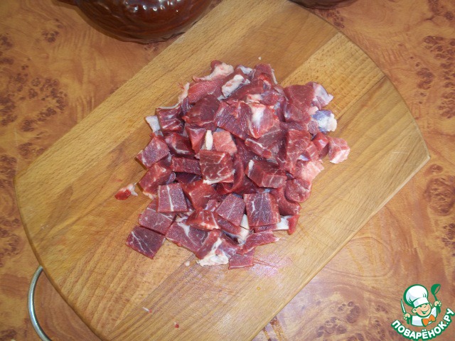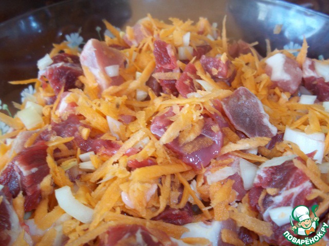 В горшки выложить мясо с овощами и влить 0,5 стакана кипятка.