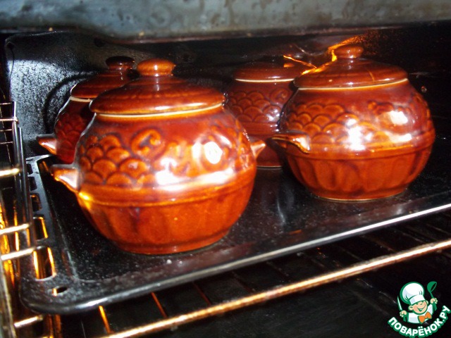 Закрыть горшки крышками. Поставить в холодную духовку. Температуру выставить 220-230 градусов. Тушить мясо примерно 60-75 мин.