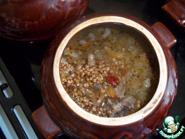 Вынуть горшки из духовки. Духовку не выключать. Положить в горшки промытую гречку. Добавить еще по 0.5 стакана кипятка в каждый горшок. В каждый горшок положить соль, сало, которое вытопилось, когда его жарили. Положить сушеные базилик и болгарский перец. Перемешать.