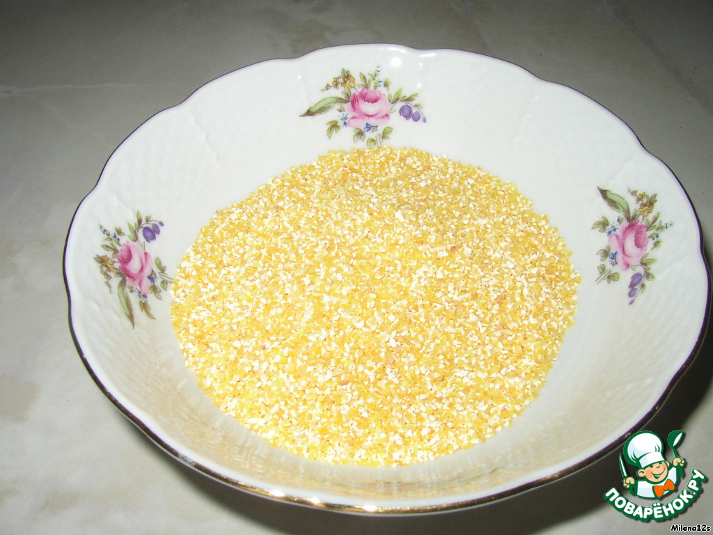 Кукурузную крупу промыть, залить водой (у меня получилось примерно 1,5 стакана воды) и варить 15-20 минут.