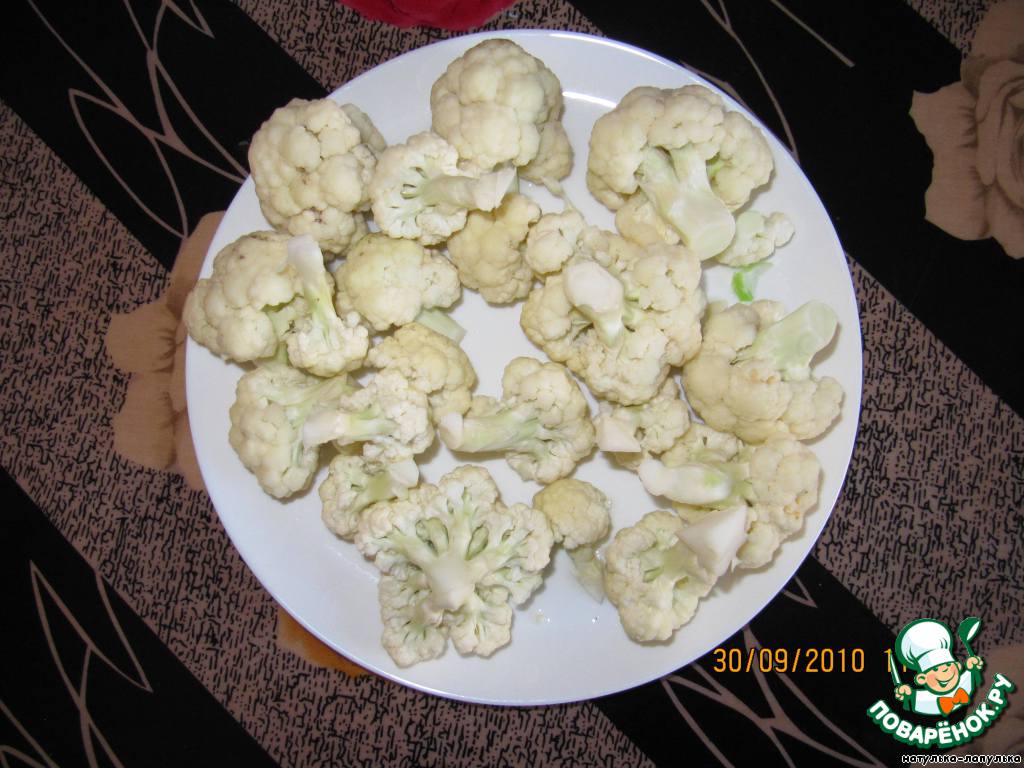 капусту отварить, разделить на цветочки,