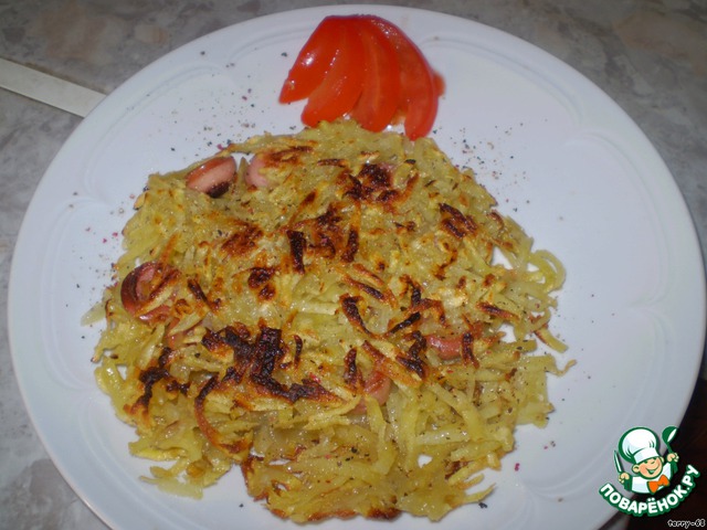 На небольшую сковородку налить растительного масла (без фанатизма), хорошо разогреть и тонким слоем выложить половину натертого картофеля.