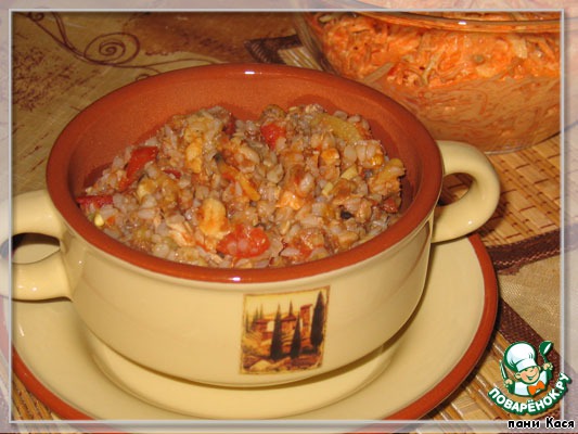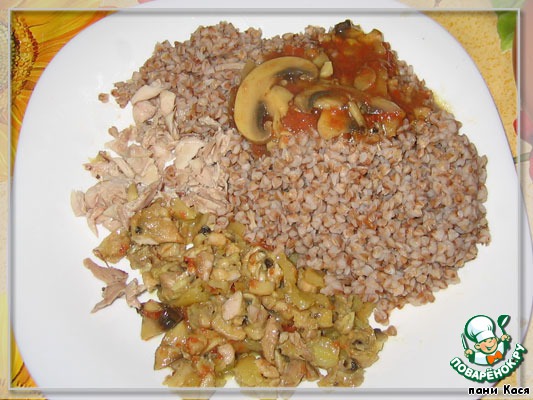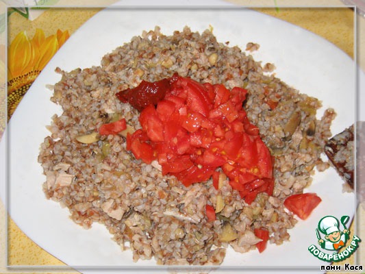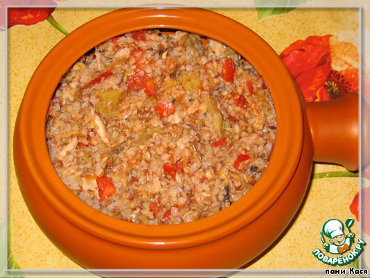 Перчик и грибы мелко порубим, добавим куриное мясо вареное (помните, у нас не съелись ножки из супа?), сварим гречку.