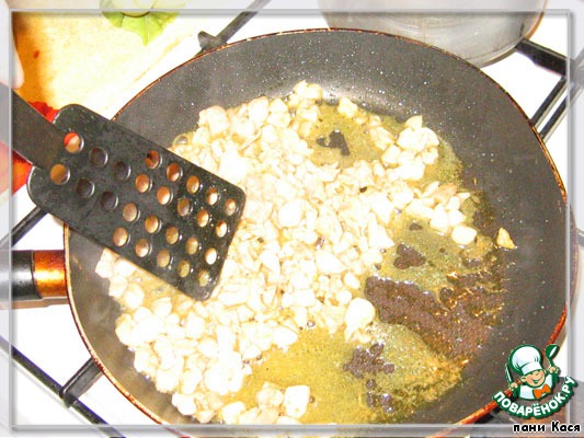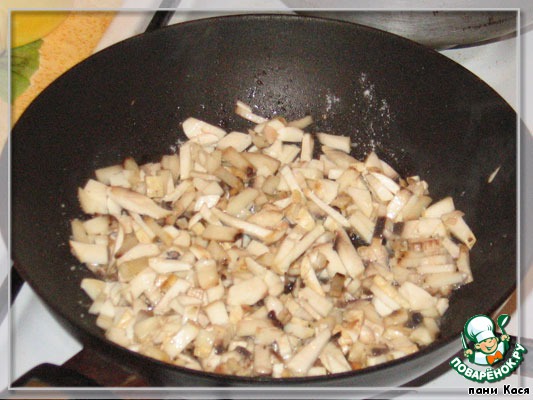 Курицу обжарим с приправой, посолим, добавим грибы и муку. Получается такая довольно вязкая начинка.