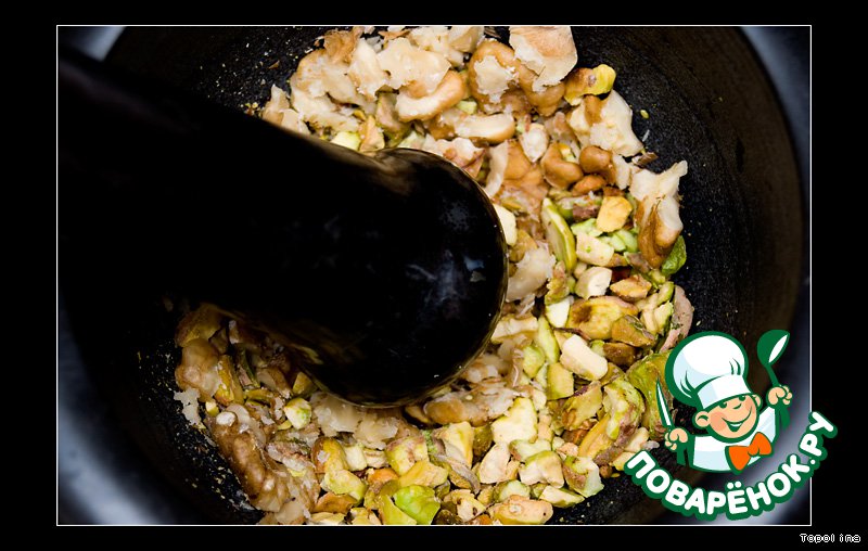 Фисташки и грецкие орехи порезать или иным способом разбить на более мелкие куски.