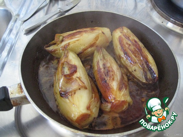 На сковороде растопить масло сливочное, добавить масло растительное и хорошо обжарить цикорий с обеих сторон (хорошо посолив и поперчив).