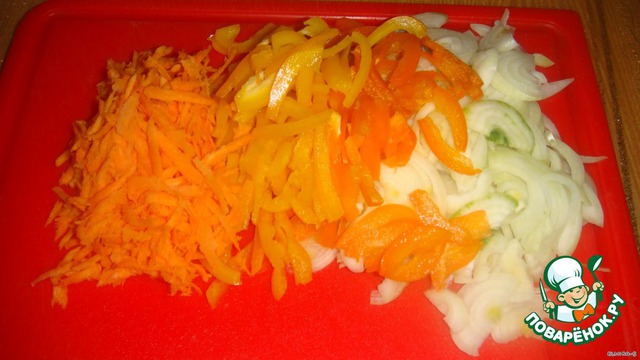 Лук порежьте полукольцами, морковь и перец соломкой, обжарьте до золотистого цвета