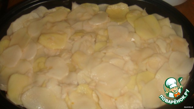 Картошку нарежьте тоненькими кольцами, противень смажьте маслом и выложите туда половина картофеля, посолите