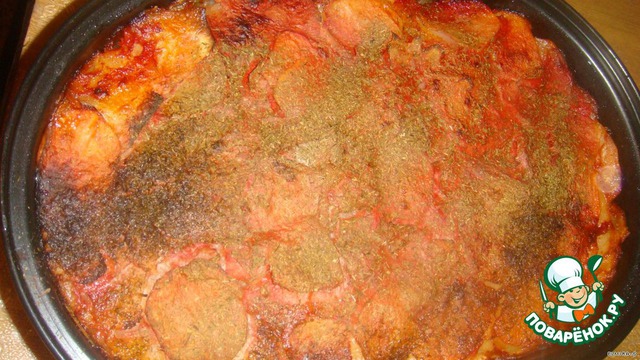 Посить немного,сверху налить томатный сок 1 стакан,и положить в разогретую духовку до 220С на 40минут