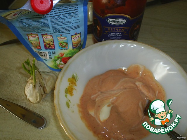2.Приготовить соус для обмазывания куриных ножек. Перемешать майонез и кетчуп в равных количествах, добавить чеснок.